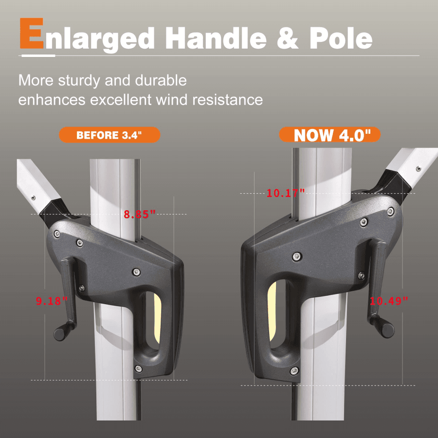 『DURABLE CANOPY & EXCELLENT STABILITY』 – The PU coated canopy of the offset patio umbrella is made of premium solution dyed fabric for fade, water and UV protection, we proudly provide 2 years fade-resistant canopy warranty. The offset umbrella pole and ribs are made of extra-thick aluminum which is lighter but make the umbrella more stable and wind-resistant.